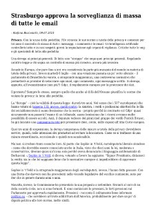 Strasburgo approva la sorveglianza di massa di tutte le email Privacy. Con la scusa della pedofilia, l'Ue straccia le sue norme a tutela della privacy e consente per tre anni il controllo di massa di tutti i messaggi, i commenti e le email. Un'intelligenza artificiale controllerà tutto e in casi sospetti girerà la segnalazione agli organi di vigilanza. Critiche tutte le ong e gli specialisti di lotta alla pedofilia Stefano Bocconetti su il manifesto