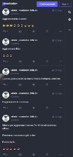 Per caso (…non tanto, quanto più perché è arrivato un toot boostato sulla mia timeline, e ciò ha fatto da trigger; lo sappiamo che tutte le cose che faccio e che vedo altro non sono che risposte all'entropia dell'universo che mi colpisce) mi è capitato di guardare il profilo admin dell'istanza Mastodon BIDA, e… sto fottutamente morendo dalle risatine amare!!! 🙀 Il profilo è usato per varie comunicazioni, ma c'è una sfilza di messaggi di qualche mese fa che è semplicemente bellissima: In un arco di 2 settimane (!) ci sono stati tutti messaggi di aggiornamento, che per logica devo immaginare siano tanti aggiornamenti diversi fatti via via che sono stati disponibili, ma… il come il tutto è scritto e fluisce mi costringe ad immaginare uno scenario più irreale: che in realtà no, hanno impiegato 2 settimane a fare un singolo aggiornamento, avendolo non si sa come spezzettato poi… 😭