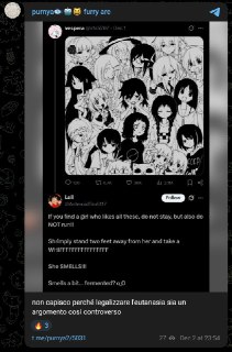 RE: https://t.me/purnya2/5031 Ma… chi ha scritto questo tweet, che cosa intende dire??? …COME SI PERMETTE??? 😶 Non mi piacciono tutte le entità immaginarie contenute nell'immaginina, tecnicamente, perché una minoranza di queste non le conosco proprio, ma questo è dovuto ai miei problemi di skill, e quindi sorvoliamo, perché chi conosco invece apprezzo… …E ALLORA, embè? Che cosa vorrebbe dire questo TWITTERISTA, che PUZZO??? 😡 Io MI LAVO (…se faccio la cacca la sera non conta), TUTTI I GIORNI (…almeno, quando c'è la corrente), e quindi no, IO NON PUZZO! E, soprattutto, non puzzo di MARCIO e fermentato, seppur il rotting sia forte nella mia anima. Io sono non una banale ragazza femcel socialmente inetta e pesantemente isolata; io sono prima di ogni cosa una RAGAZZA MAGICA ormai!!! Sono potente e PROFUMATA; e si, sono anche molto sensibile, quindi me la prendo ora, anche se chi ha prodotto questo assurdo pensiero non mi conosce nemmeno, perché il principio stesso è PUZZOLENTE. 😤 source
