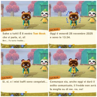 A seguito di ulteriori riflessioni sul giorno 28 novembre 2025 all'interno del giochino crostinante, mi arriva effettivamente il sospetto che, gli spiriti che lì regolano il meteo, abbiano volutamente e con una qualche malvagia agenda di fondo fatto qualcosa per raffreddare le temperature ed intristire l'atmosfera, appassire le vibe, e oh no… 😰 Tom Nook, nonostante tutto il pelo che presumo abbia, quello che sembra un maglione di lana addosso, e una giacca che credo invernale (seppur lasciata aperta, mannaggia a lui… e ok, forse con la panza che ha non riuscirebbe proprio a chiuderla, ma ha il suo logo sopra, quindi suppongo poteva farsela fare tranquillamente di una misura più adatta…), trema e dichiara di morire di freddo… 🥴 Certo, forse lui non è affidabilissimo, visto che dichiara anche di avere i baffi congelati, ma a me non risulta che lui abbia mai avuto baffi… e dato anche che gli altri animali non sembrano lamentarsi del clima…