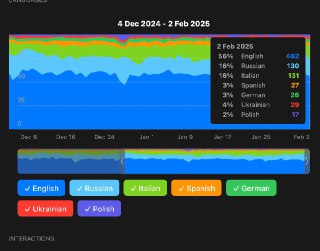 acording to tg analytics english is (understandably, considering i make stuff in english) the first language spoken by people following this telegram channel, BUT RIGHT AFTER IT WE HAVE RUSSIAN AND ITALIAN TIED FOR SECOND PLACE then right after that spanish, german, ukrainian and polish