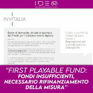 FIRST PLAYABLE FUND "Fondi insufficienti per coprire le esigenze del settore, necessario l’immediato rifinanziamento della misura di sostegno promossa dal MISE e gestita da Invitalia e il potenziamento della sua dotazione finanziaria." Questo il commento di IIDEA a fronte della chiusura dello sportello a poche ore dalla sua apertura nella giornata di oggi a causa del boom di domande presentate dagli operatori del settore che hanno in brevissimo tempo esaurito i 4 milioni di euro disponibili. "Se da un lato l’ampia partecipazione può essere vista come un segnale positivo di interesse per l'intervento, dall’altro conferma l’assoluta inadeguatezza della dotazione finanziaria disponibile per sostenere lo sviluppo dell’industria dei videogiochi italiana."