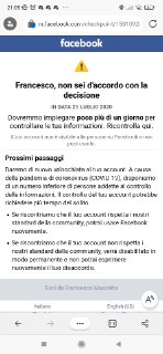 Ogni tanto controllo il mio vecchio account su Facebook per vedere se è stato sbloccato o se è stato definitivamente rimosso. Ma, dal 21 luglio 2020, si trova in "osservazione". Per fortuna che la procedura sarebbe dovuta durare "poco più di un giorno" (frase evidenziata in grassetto). Fosse stato un dipendente pubblico ad accumulare tale ritardo ora si starebbe preparando il pubblico linciaggio sulla piazza...