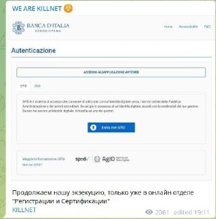 Ancora un attacco di #killnet al nostro Paese. Le didascalie recitano: Un'altra buona notizia. Bloccato il sistema di gestione delle autorità della principale Banca d'Italia. Seguito da "Sistema di autenticazione" Anche l'autenticazione con chiave CNS è disabilitata. Probabilmente ora centinaia di impiegati di banca dall'Italia ci stanno ringraziando! Continuiamo la nostra esecuzione, solo nel reparto online "Registrazione e Certificazione"