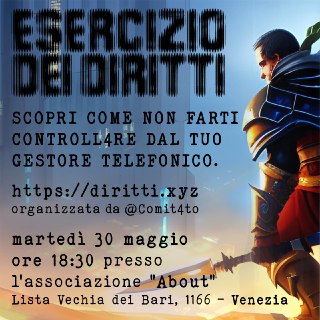 Il 30 maggio 2023 alle ore 18:30 presso l’associazione About ci sarà la prima presentazione pubblica dell’esercizio dei diritti per impedire alla Smart Control Room di Venezia e agli operatori telefonici di tutta Italia di elaborare dati sulla vostra posizione. NON MANCATE!