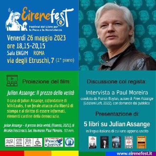 A Roma questo venerdì-sabato-domenica c’è l’Eirenefest con, venerdì sera alle 18.15, due ore dedicate a Julian Assange con un film sulla sua vita, un’intervista con il regista e poi la presentazione dei 5 libri finora usciti sul caso Assange (di cui uno proprio in questi giorni). PARTECIPATE SE POTETE!