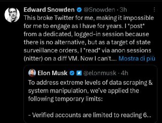 Questo (l'impossibilità di leggere i tweet senza essere loggati e la limitazione dei messaggi leggibili anche per gli utenti non verificati, ndr) per me ha rotto Twitter, rendendomi impossibile impegnarmi come ho fatto per anni. Io *posto* da una sessione dedicata e connessa perché non c'è alternativa, ma come obiettivo degli ordini di sorveglianza dello stato, *leggo* tramite sessioni anonime (nitter) su una VM diff. Ora non posso più farlo. (è ora di passare al Fediverso, Edward! ndr)