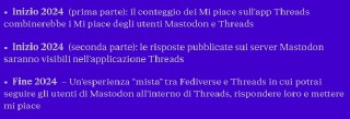 Uno sguardo alla roadmap di Threads/ActivityPub Tom Coates ha recentemente partecipato a un incontro con il team di Meta's Threads per parlare di ActivityPub, del fediverso e del futuro dei social. Ha preso molti appunti interessanti! E in quelle note ha una tabella di marcia per il prossimo futuro per i piani di decentralizzazione di Threads https://www.theverge.com/2024/1/11/24035256/a-peek-at-the-threads-activitypub-roadmap
