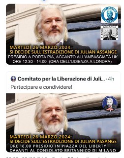 #Roma #Milano e #Napoli in orari diversi si mobilitano DOMANI 26/3, giorno in cui l’Alta Corte a Londra deciderà se estradare Julian o accettare almeno in parte i punti presentati in appello dalla difesa il 20 e 21 DOBBIAMO ESSERE IN TANTI VI ASPETTIAMO Controllate gli orari nelle locandine delle diverse città !! #FreeAssange