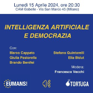 Intelligenza Artificiale e Democrazia Quali sono i potenziali rischi e benefici dell'intelligenza artificiale per la democrazia? Come si può realizzare un'AI civica Europea? Ne parleranno Marco Cappato, Giulia Pastorella, Brando Benifei, Stefano Quintarelli ed Elia Bidut, lunedì 15 aprile alle 20 30 al CAM Gabelle, via San Marco 45, Milano. Ingresso gratuito, ma su prenotazione: https://bit.ly/43M9aWh