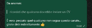 Da anomm: > ricordati che qualcuno dovrebbe inviare un CV È vero, peccato quel qualcuno non segua questo canale... glielo dirò indirettamente 👍
