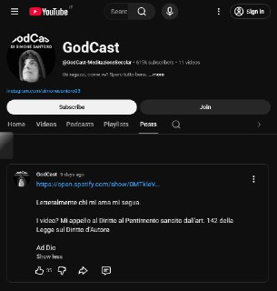 Io (per stare bene nel tema, per giunta) NON ci posso credere… Stasera, sull'aggregatore di feed scopro una cosa allucinante, e cioè che — da una settimana buona, ma io ho come al solito un piccolo ritardo — il canale di DUDUBBI, beati chi se lo ricordano, è diventato… GODCAST!!! Non ho parole. 😭😭😭 Sapevo già che il signorone si era messo a fare proselitismo religioso… qualche mese fa lo beccai su Twitch a trasmettere precisamente qualcosa di quel tipo, se non ricordo male. E, inoltre, sapevo già e già avevo raccontato di movimenti strambi osservati sul suo canale YouTube, per cui mesi fa un botto di video erano spariti, ma… Ora tutte le belle cose di un tempo sono state buttate nel cesso e il vecchio canale è stato malamente riciclato… e per ospitare non chissà cosa, ma UN PODCAST! E vabbè… ora sul canale di Simone non si bestemmia più, suppongo, e si toglie pure l'evidenza che lo si sia mai fatto in passato. Preghiamo. 💀 source
