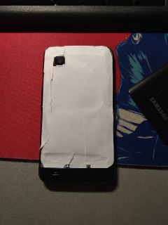 Visto che la cover posteriore di questo Galaxy aveva fatto questa fine che ha fatto, ma dato che la batteria in realtà si tiene al suo posto (a maggior ragione perché ci avevo messo uno spessorino di carta), pensavo di poterla proprio togliere da mezzo, e tenerlo così com'è, nudo… 😳 Peccato solo che, con quello scotch biadesivo messo lì, è tutto appiccicoso, e non ho idea di come toglierlo… (Cioè, in realtà si: l'alcol, come al solito utile per risolvere qualsiasi problema!… Ma mi scoccio.) Allora, ho creato al volo una nuova rivoluzione: una backcover di carta!!! Ho tagliato un foglio di carta bianco (beh, non ne ho neri come il dispositivo purtroppo) a poco più delle giuste dimensioni, l'ho appiccicato sopra, poi col taglierino ho tolto via l'eccesso e fatto il buco per la fotocamera (come se servisse, poi…), ed ecco fatto. 👌 È un po' cursed, ok, ma non è proprio un incredibile disastro…