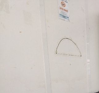 Spacc of a plastic wall in the main school hall, it has this semicircle hole cut into it and "fixed" with scotch tape, and also the wall is full of scotch marks and a bit dirty