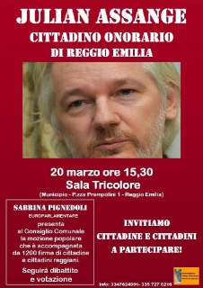 Lunedì 20 Marzo alle 15.30 a Reggio Emilia, l’Europarlamentare Sabrina Pignedoli presenterà al Consiglio Comunale la mozione popolare sostenuta da 1200 firme di cittadine e cittadini reggiani per la cittadinanza onoraria a Julian Assange. Seguirà dibattito e votazione in Consiglio. Forza! Assange cittadino onorario di Reggio Emilia subito!